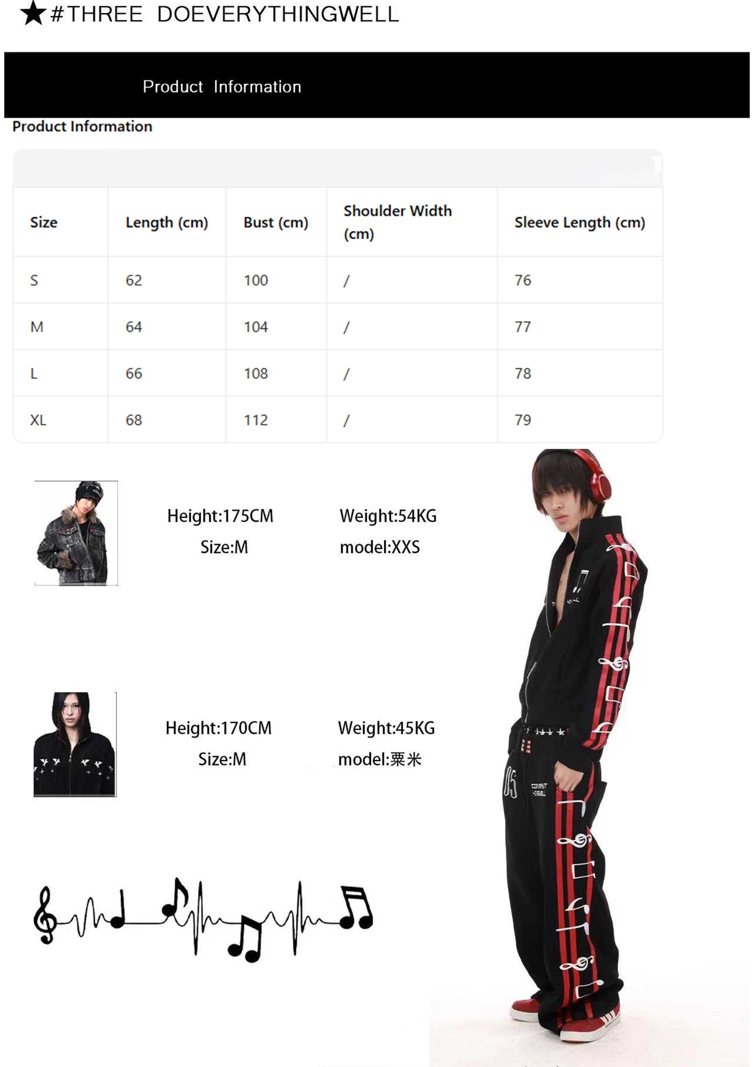 - Matching:Layer a black rhinestone skull long-sleeve top underneath, pair it with the matching musical note-embroidered wide-leg pants, and finish with red-and-white color-blocked sneakers. Accessorize with red over-ear headphones and a metal chain. The cropped jacket optimizes body proportions, while the musical note embroidery becomes a visual focal point. The overall look balances athletic energy and street personality, fitting the vibrant atmosphere of music festivals and fashion markets.