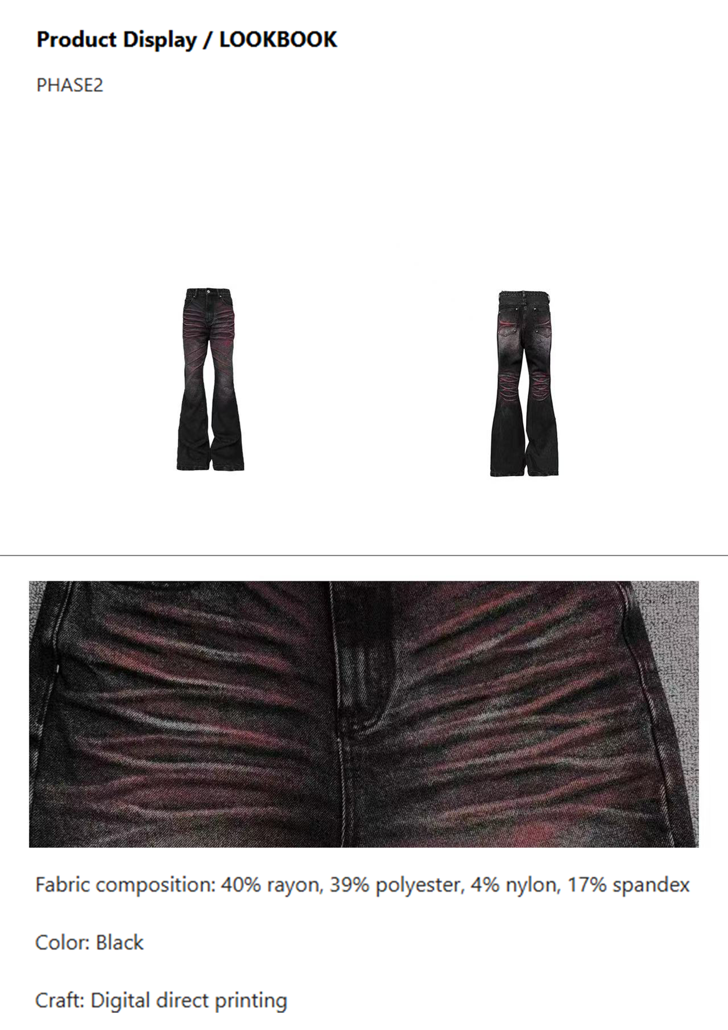 Centered on the collision of "dark punk and retro American" styles, the washed blood claw process creates a 张力 - filled red - black gradient texture on denim, like artistic symbols surging in the dark night. It not only retains the classic texture of denim but also injects a rebellious and unruly fashion attitude. The flared fit adds retro romance and casual aura to the whole.