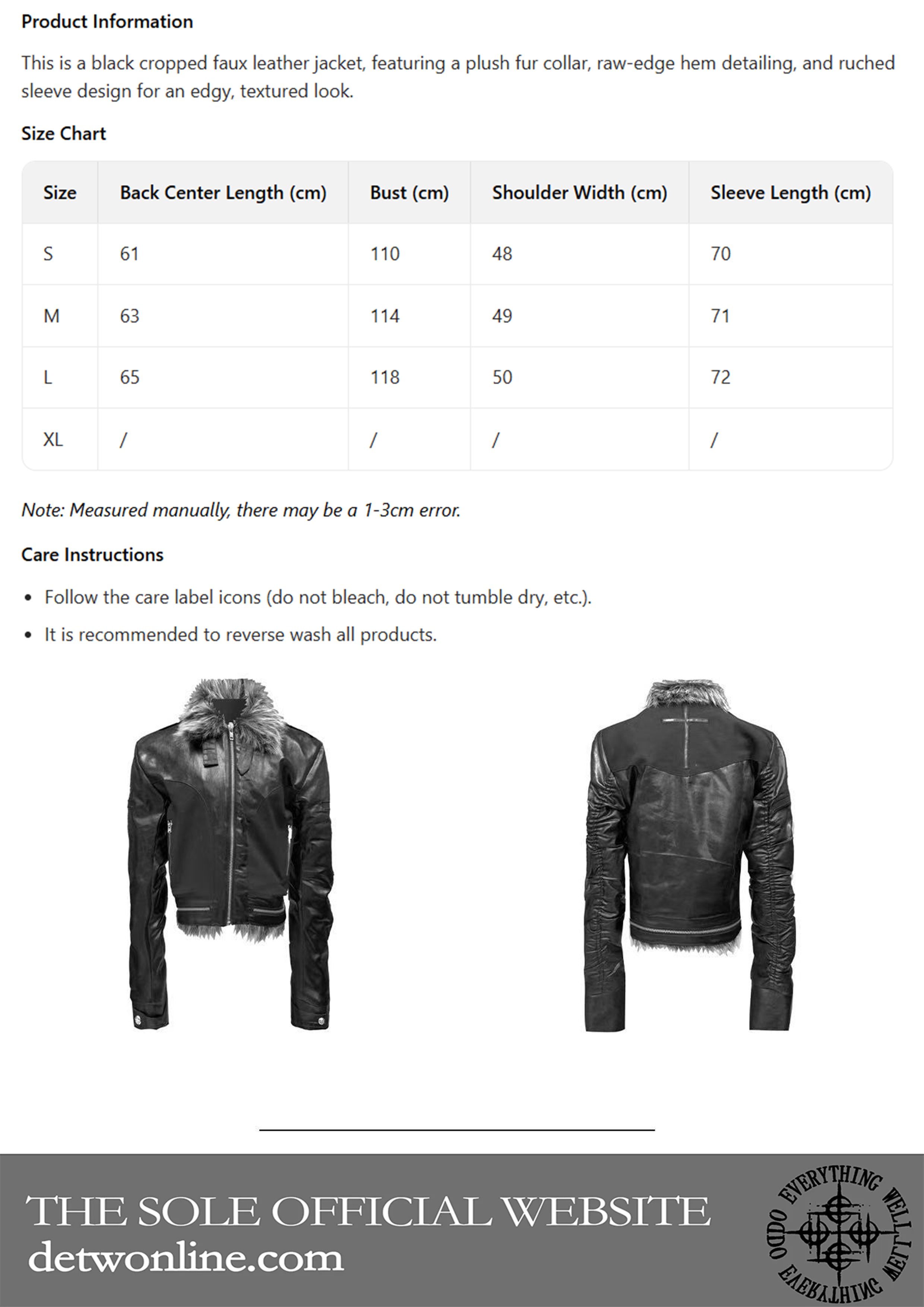 - Matching:Layer a distressed black crew-neck T-shirt underneath, then wear this paneled fur collar jacket; Pair it with dark functional wide-leg pants (with metal buckle details) and platform Martin boots, and accessorize with layered metal cross necklaces and leather gloves. The cropped silhouette optimizes body proportions, the all-black color scheme enhances the dark atmosphere, and the metal elements echo the jacket’s biker details, fitting the avant-garde personality needs of art exhibitions and parties.
