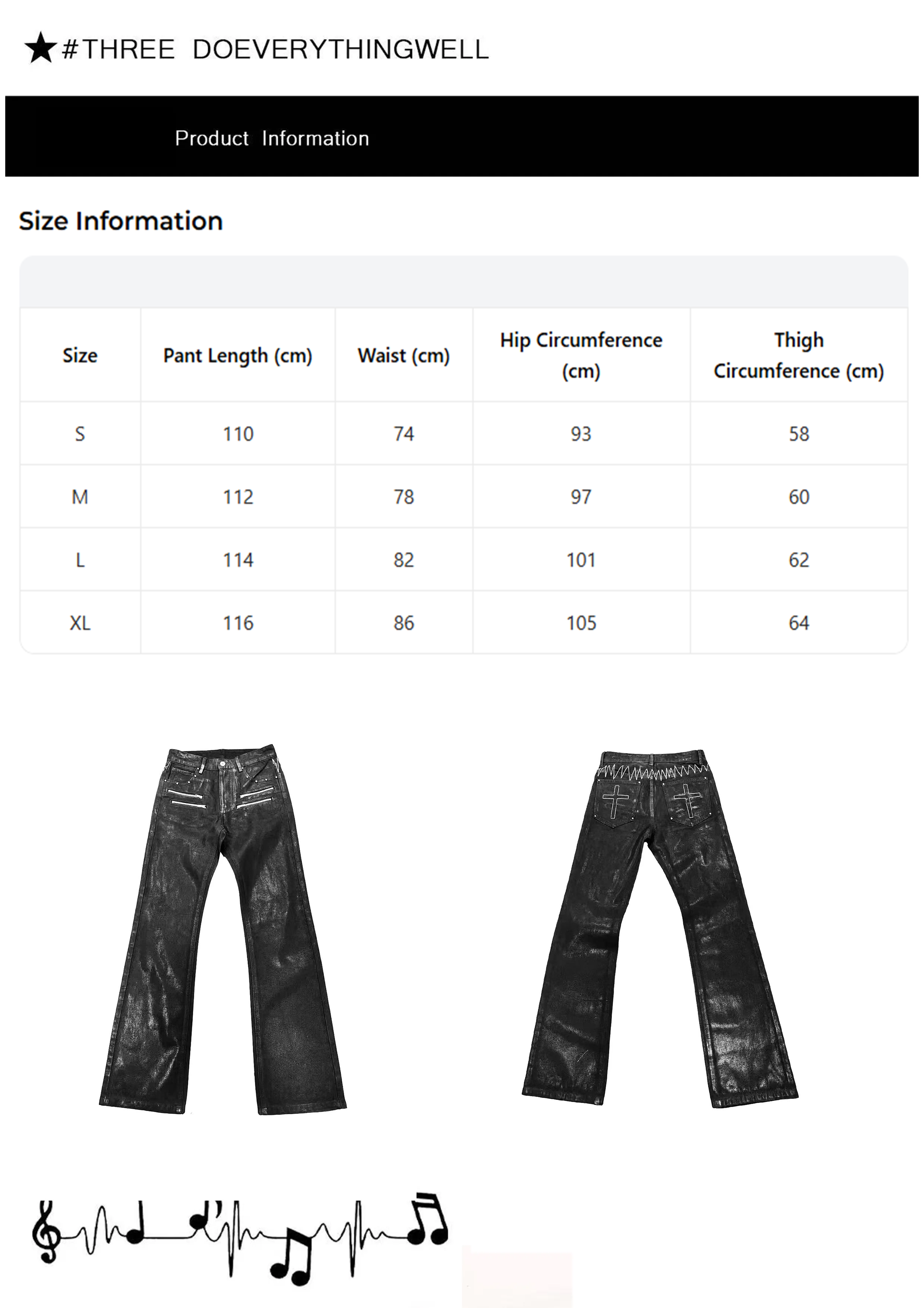 - Design Concept: The core design concept is "two-way balance of metal wax-washed retro texture and goth punk dark style". Exclusive full-pant metal wax craft, different from ordinary washed denim, owns advanced dark glossy texture. Front zipper pockets and waist rivets inject punk functional vibe, while back cross embroidery and zigzag waist topstitch strengthen dark goth recognition. The classic high-waist flared silhouette achieves body slimming, leg shaping and daily practicality at the same time. The gender-neutral cut adapts to diverse style expression for both men and women, highly fitting the current popular trend of dark goth, punk streetwear and metal wax retro revival.