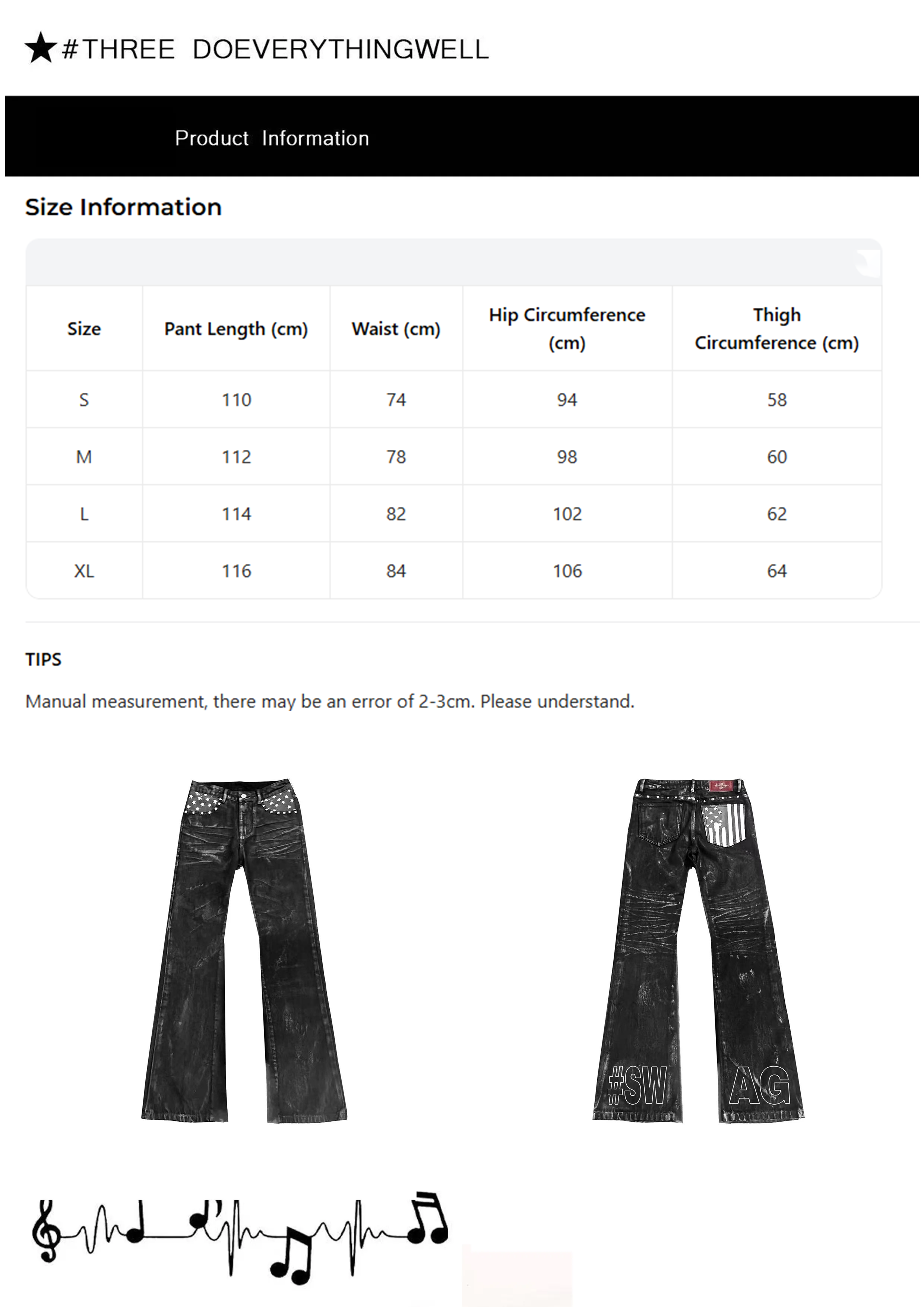 - Design Concept: The core design concept is "the perfect balance of American retro punk and dark wasteland style". It breaks the simplicity of traditional denim, adopts full-pant wax-washed vintage craft, combined with multiple distinctive details including star studs, American flag print, waist rivets and hem letter prints. The classic high-waist flared silhouette achieves slim leg-lengthening effect, comfort and practicality at the same time. The gender-neutral design adapts to diverse style expression for both men and women, highly fitting the current popular trend of American retro punk and dark streetwear.