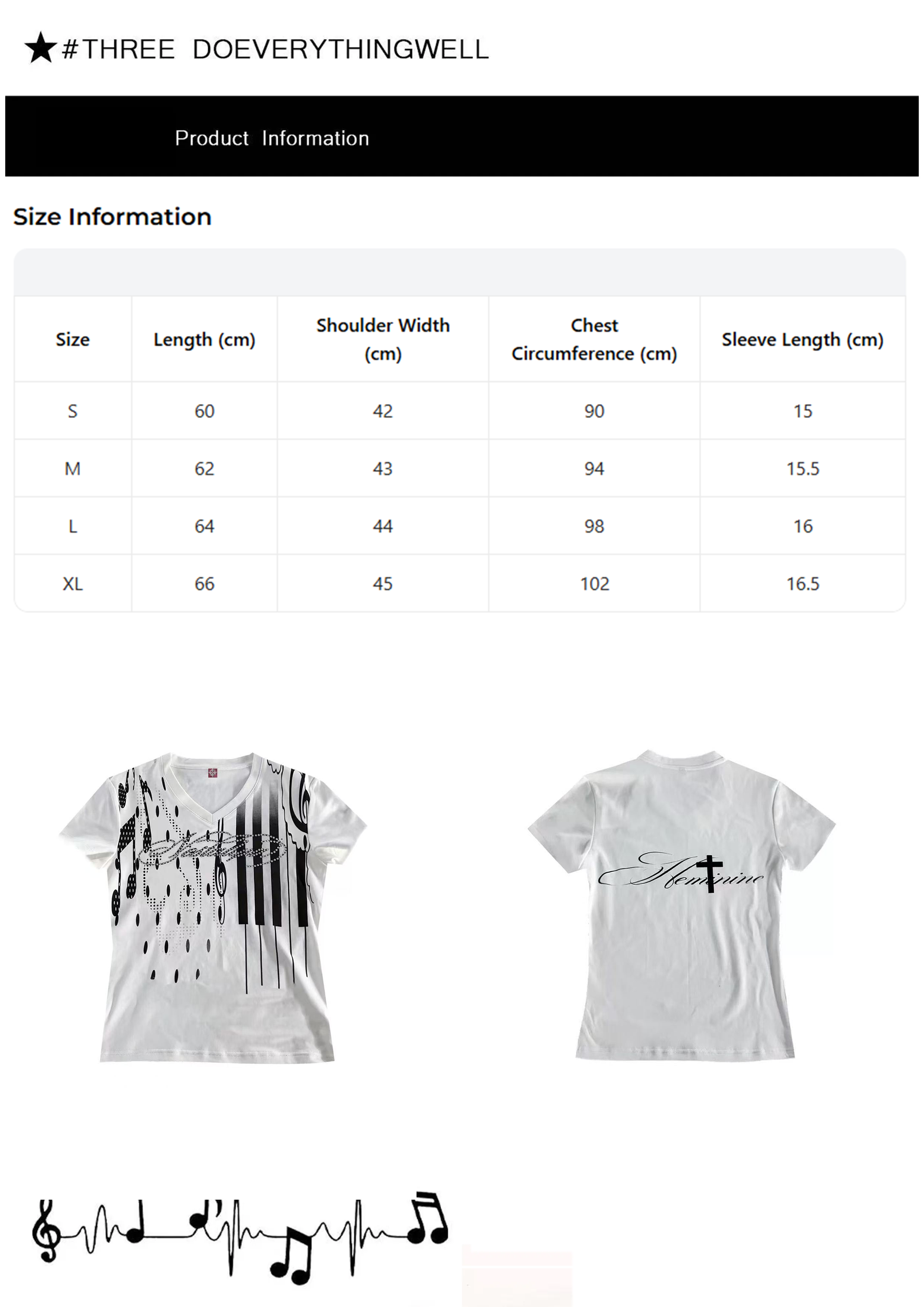 - Design Concept: The core design concept is "two-way integration of elegant music art and dark goth street style". The gentle V-neck silhouette optimizes neck lines, the close-fitting slim cut slims body without tightness, and the skin-friendly fabric ensures daily comfort and versatility. Piano keys, musical note artistic prints and exquisite rhinestone details on the front improve delicate high-end texture. The cursive English cross totem on the back injects mysterious dark goth personality, breaking the monotony of basic pure white style. The gender-neutral cut adapts to diverse style expression for both men and women, balancing daily practicality and styling recognition, highly fitting the current popular trend of Y2K edgy-sweet and literary dark niche fashion.