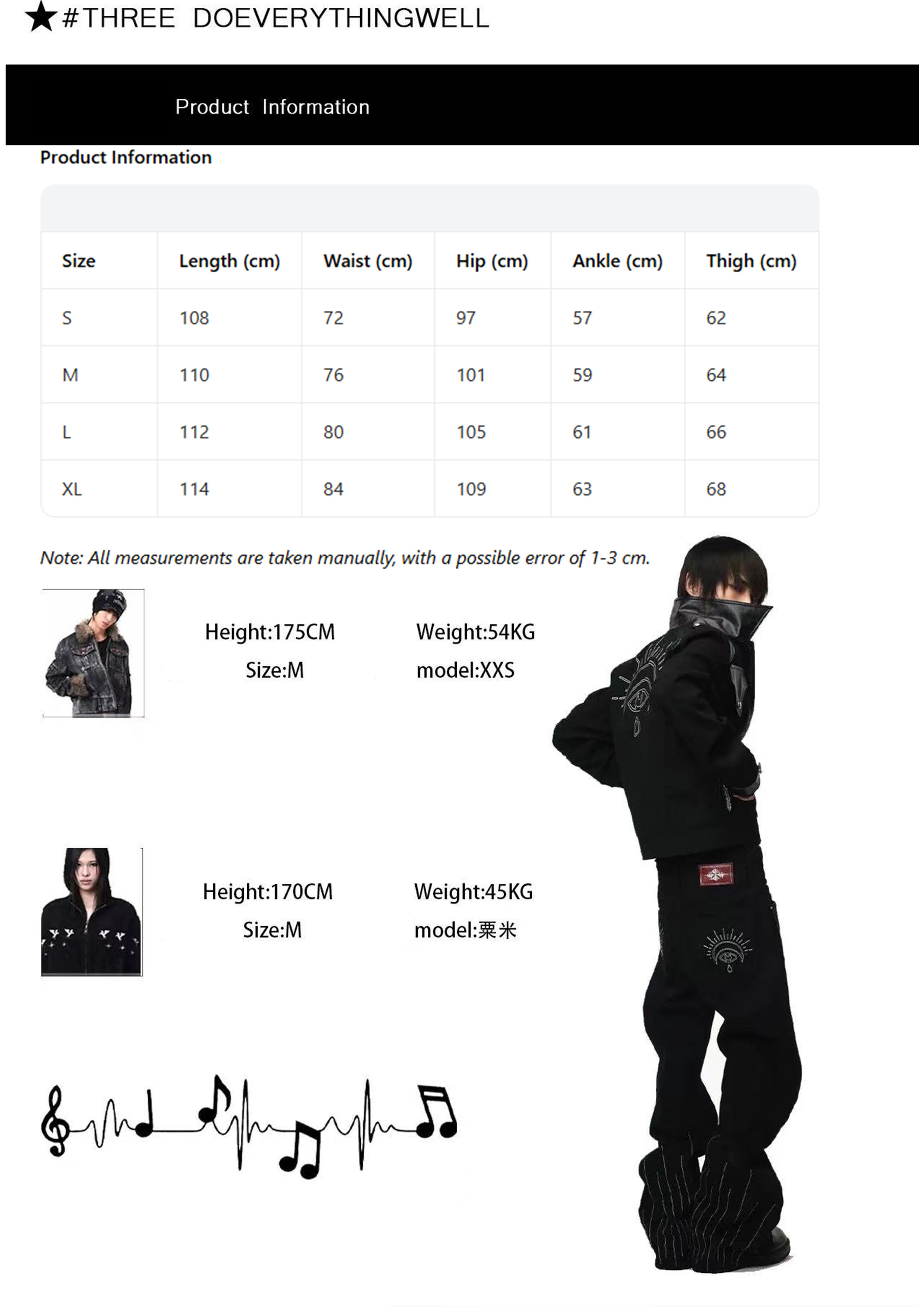 - Design Concept: The core design concept is the "avant-garde reconstruction of retro denim". Breaking the casual attribute of traditional jeans, it strengthens the hardcore texture with heavyweight washed black denim, and endows artistic expression through three-dimensional line embroidery and occult symbol embroidery. The bootcut stacked silhouette balances retro street style and wearing comfort, aiming to create a functional item that can express the attitude of dark subculture and adapt to daily wear, meeting young people’s dual needs of "personality expression + practical versatility".