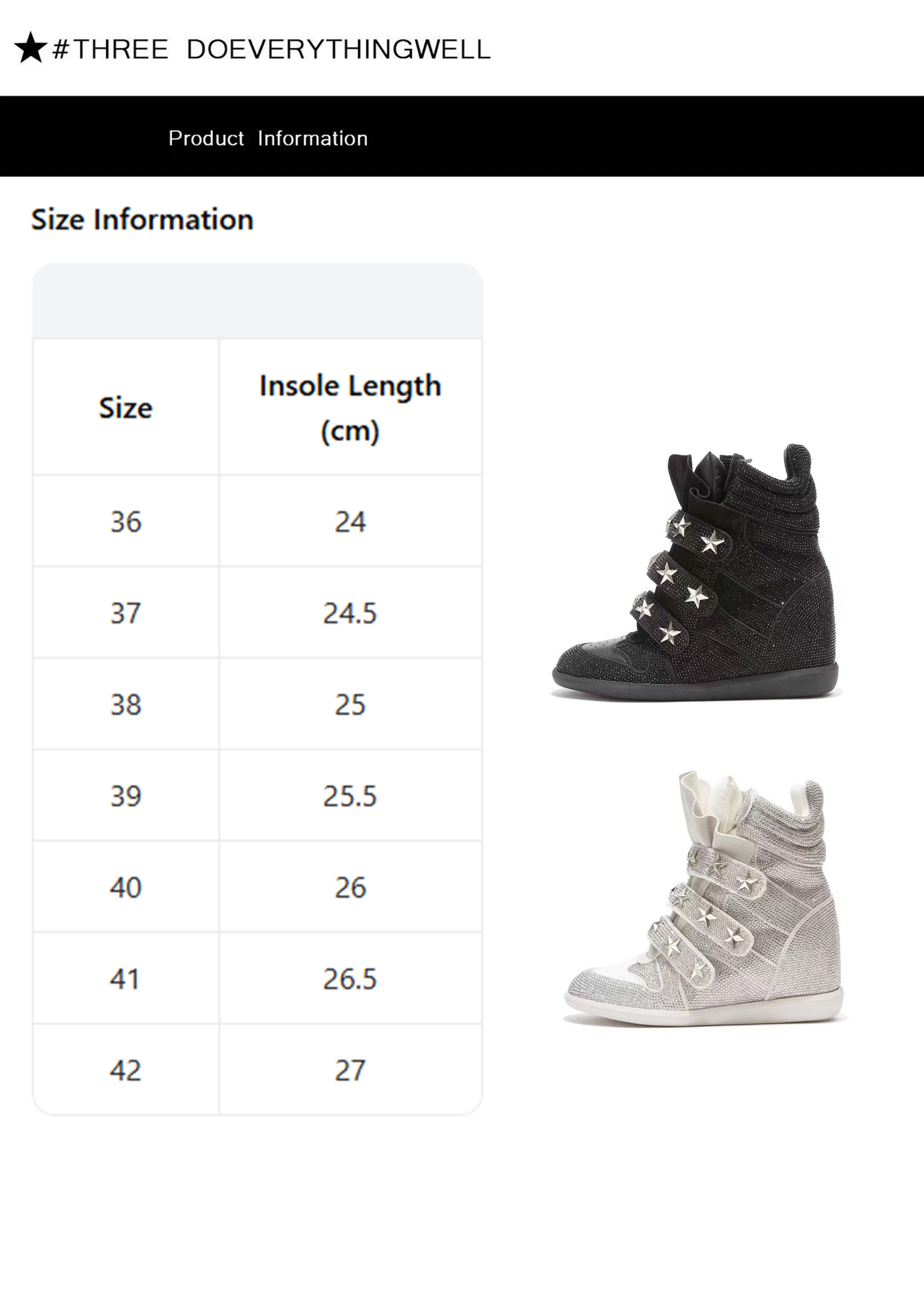 - Design Concept:The core design concept is "the two-way balance of unisex dazzle and comfortable height increase". Featuring full hot-diamond craftsmanship as the core selling point, it ensures extremely high reflectivity and dazzle under different light sources, breaking the boundaries of gender-specific dressing and creating a trendy unisex item. The built-in hidden wedge design balances comfort and height enhancement, while metal star studs and Velcro straps strengthen the punk street style, and the high-top silhouette adapts to diverse wearing scenarios. These shoes are not just sneakers, but a trendy statement piece designed to make wearers of all genders confident and stand out in any dazzling occasion, achieving the perfect integration of style, comfort and gender-neutral dressing.