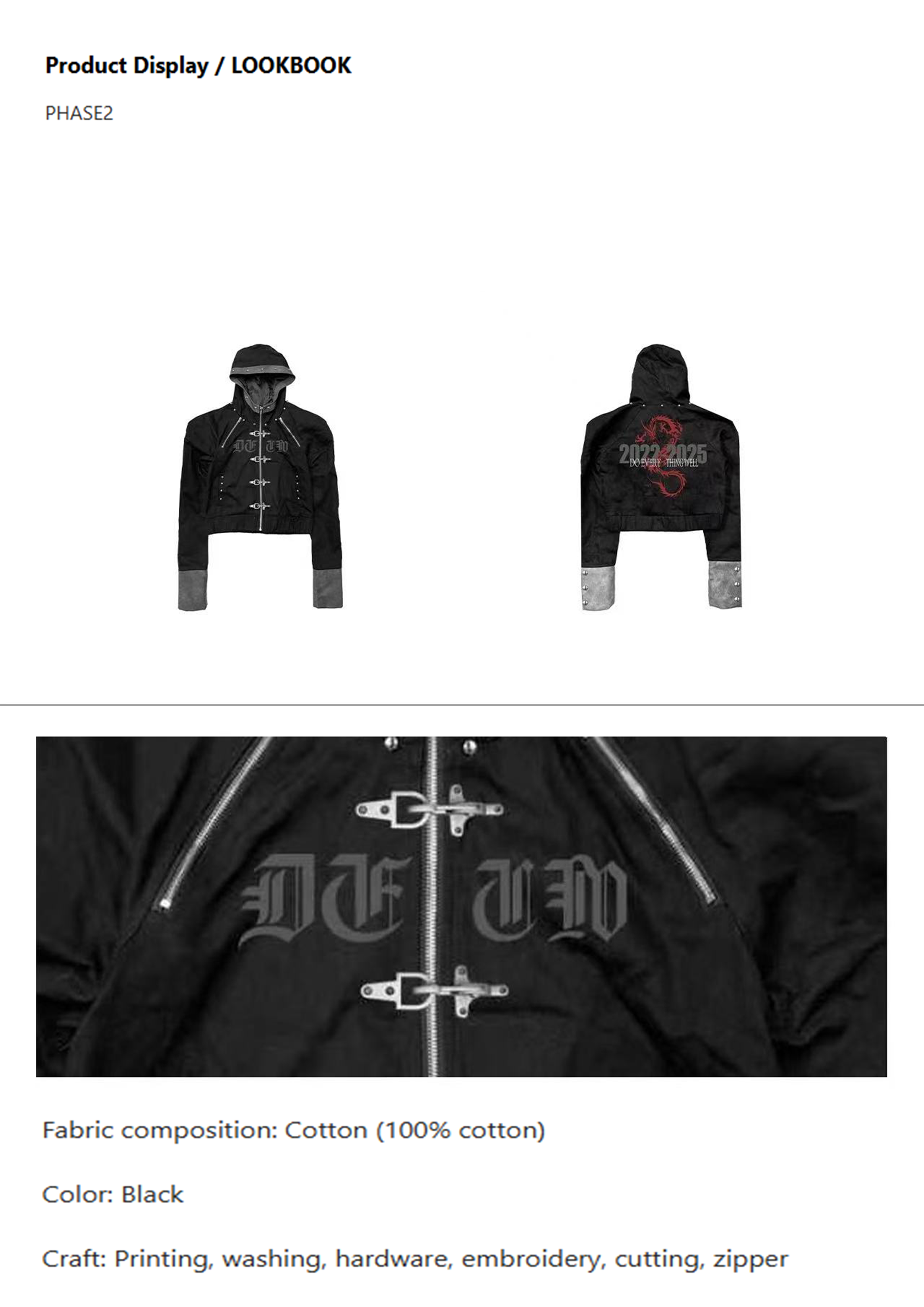 Drawing inspiration from the fusion of Eastern dragon culture and punk elements, the dragon pattern is presented in bright red on the black garment, combined with metal hardware and unique tailoring, creating a visual effect that is both imbued with Eastern mystery and punk rebellion. At the same time, the hooded design is incorporated to enhance practicality and styling.