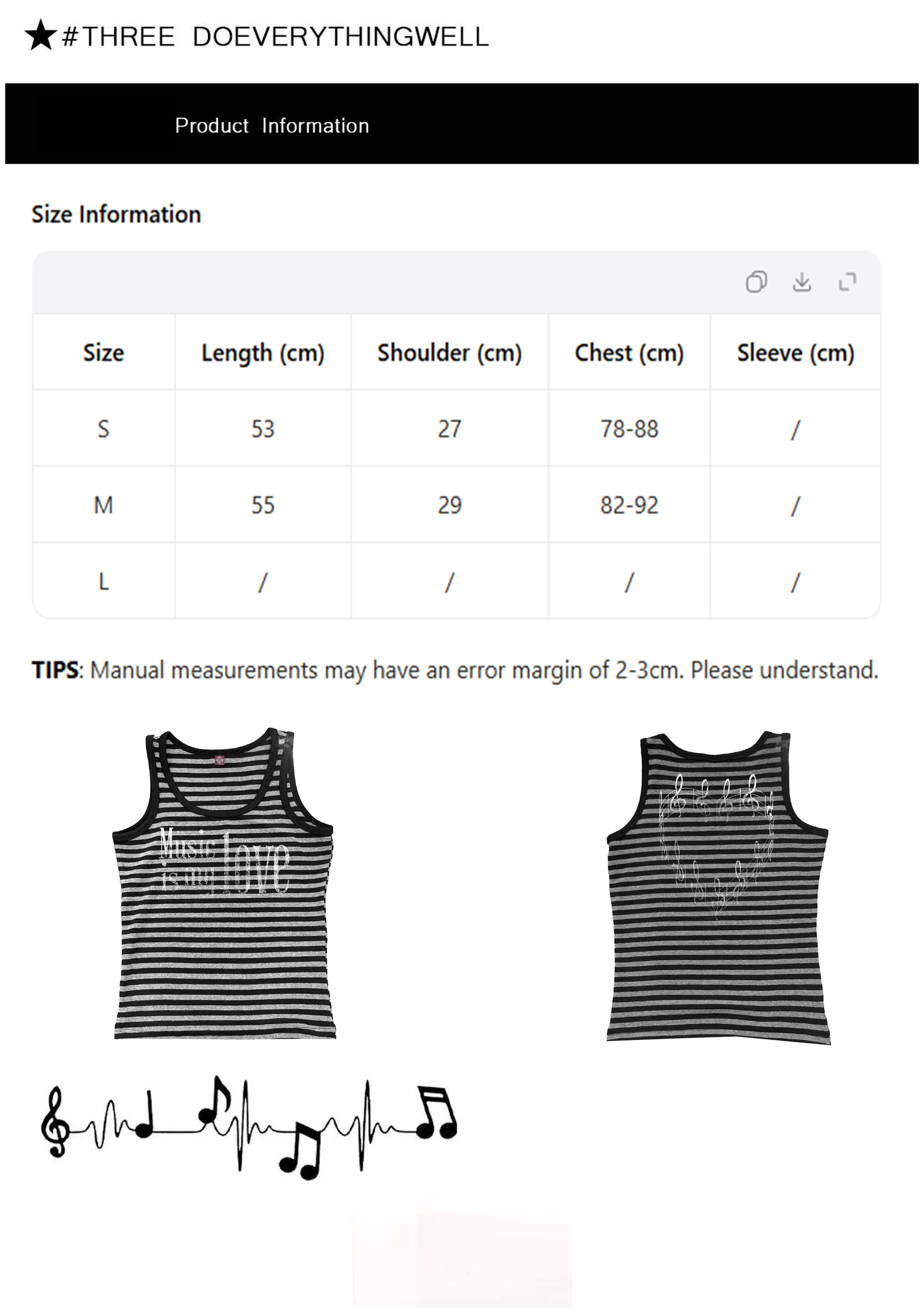 - Design Concept: The core design concept is "the dual expression of music love and millennial retro". Based on classic black and white stripes, it strengthens the music theme with music slogan and music note heart print, and enhances the detail texture with rhinestone craft. The slim-fit scoop neck silhouette optimizes body proportions, meeting the dressing expression of music lovers and adapting to the daily wear needs of Y2K spicy girls, creating a versatile item with both personality and practicality.