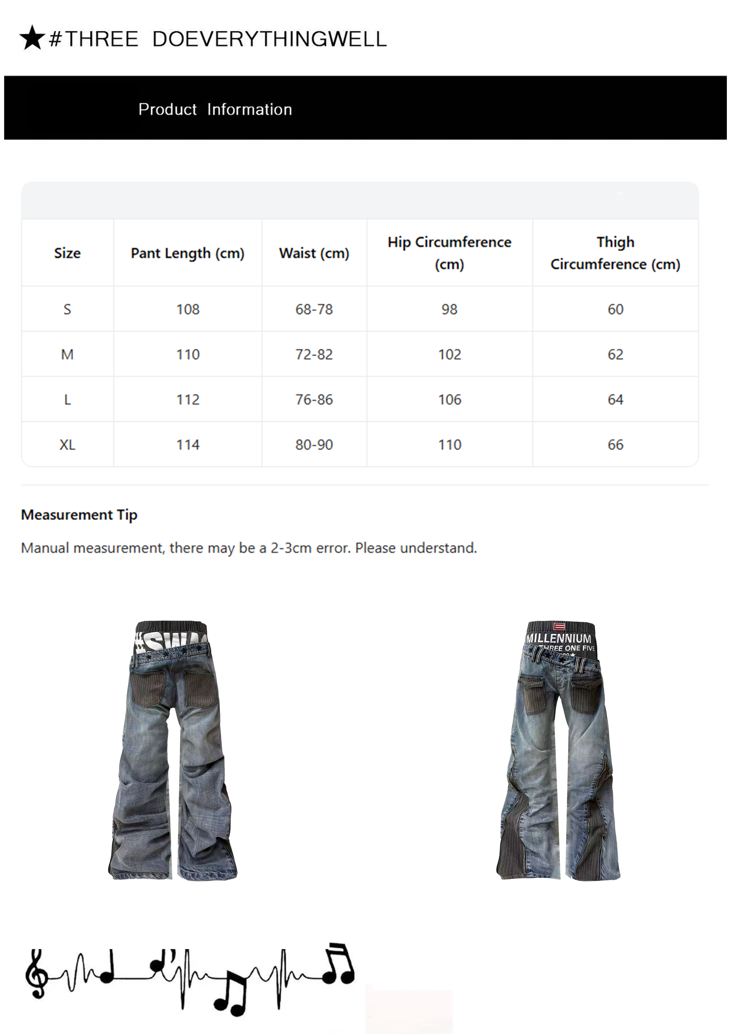 - Design Concept: The core design concept is "two-way balance of retro deconstructive cutting and street fashion style". The innovative printed elastic waist replaces traditional denim button waist, providing unrestricted comfortable wearing. The full-pant vintage washed craft restores retro aged texture, and multiple deconstructive details including pocket splicing, side zipper split and star studs strengthen street personality. The loose wide flared silhouette achieves body slimming, leg shaping and daily practicality at the same time. The gender-neutral design adapts to diverse style expression for both men and women, highly fitting the current popular trend of Y2K retro revival and American street deconstruction.