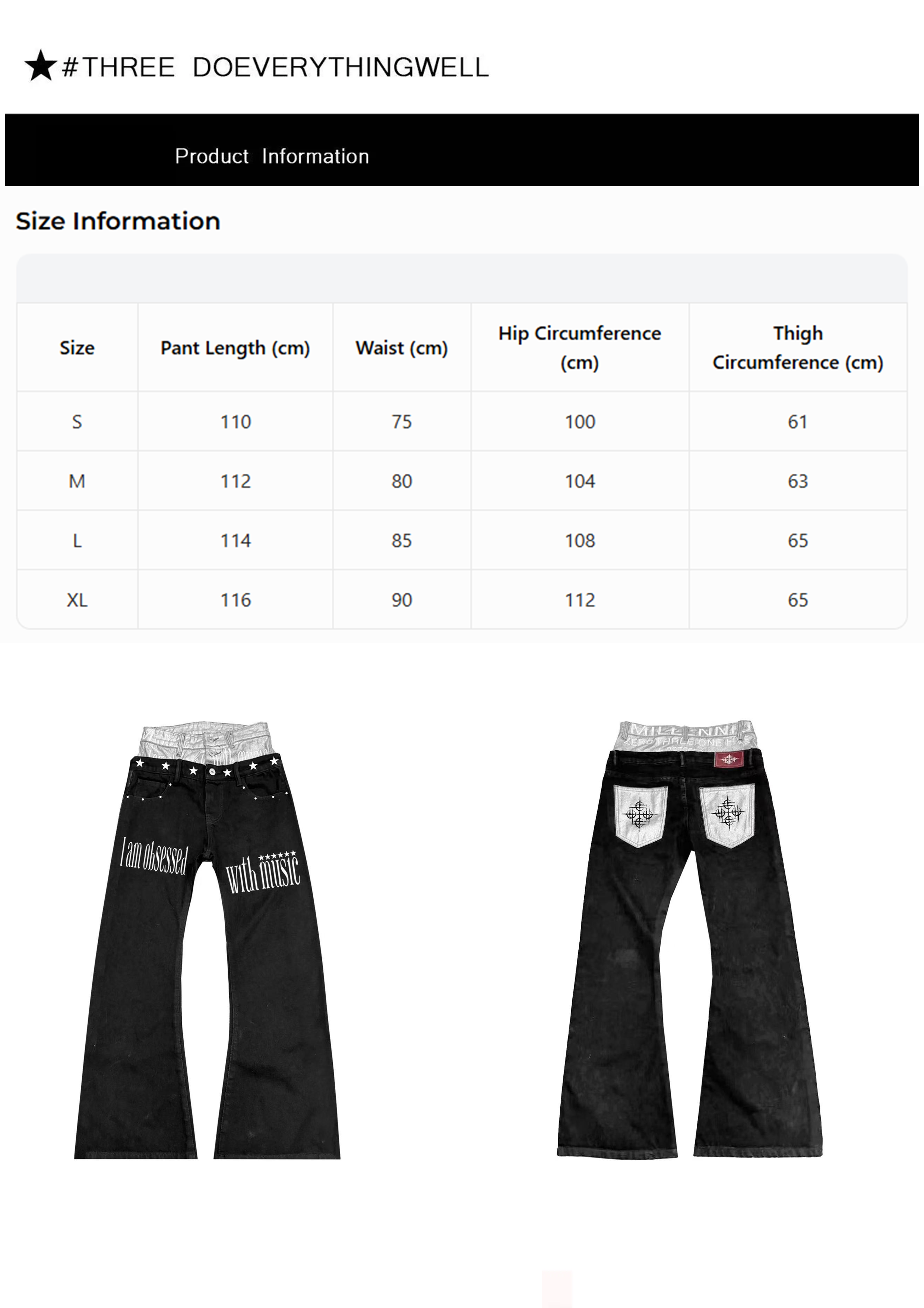 - Design Concept: The core design concept is "two-way balance of Y2K millennial silver-coated futurism and dark music punk street style". Exclusive silver-coated double waistband design, different from ordinary denim, owns metallic luster millennial futuristic atmosphere. Five-pointed star rivets on outer waistband and music slogan print on front inject street punk attitude, while cross totem on back pockets and millennium print on inner waistband strengthen dark goth recognition. The classic high-waist flared silhouette achieves body slimming, leg shaping and daily practicality at the same time. The gender-neutral design adapts to diverse style expression for both men and women, highly fitting the current popular trend of Y2K millennial revival, dark goth and American music punk.