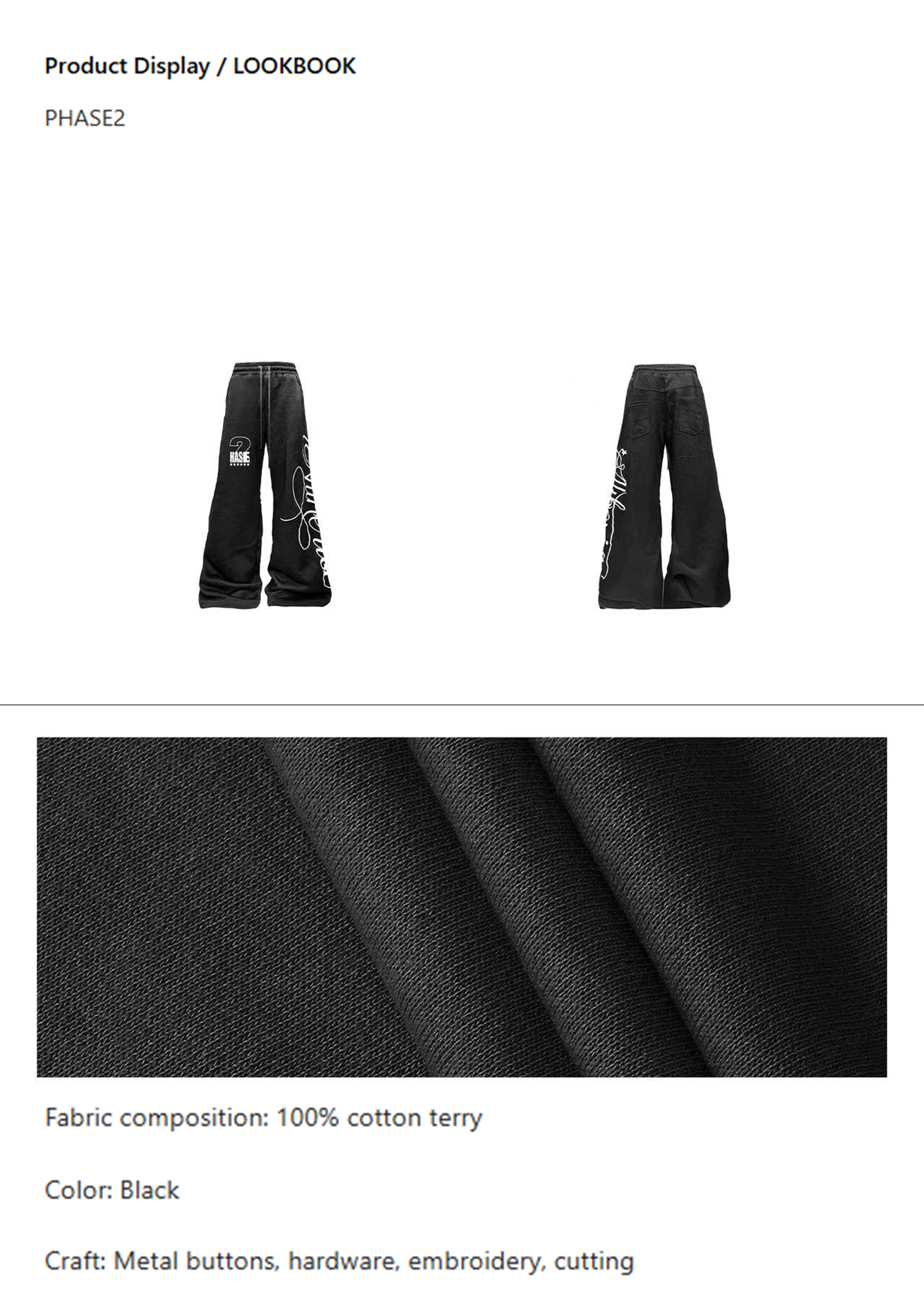 - Design Concept: Focusing on the collision of street hip-hop and dark subculture, the full cotton terry fabric ensures comfort and texture. The large-area embroidered lettering print showcases a personal attitude, and the metal hardware embellishments enhance the niche style. The loose wide-leg fit improves the styling and inclusivity of the outfit, allowing people of different genders to create a unique look that combines street coolness and dark exquisiteness.