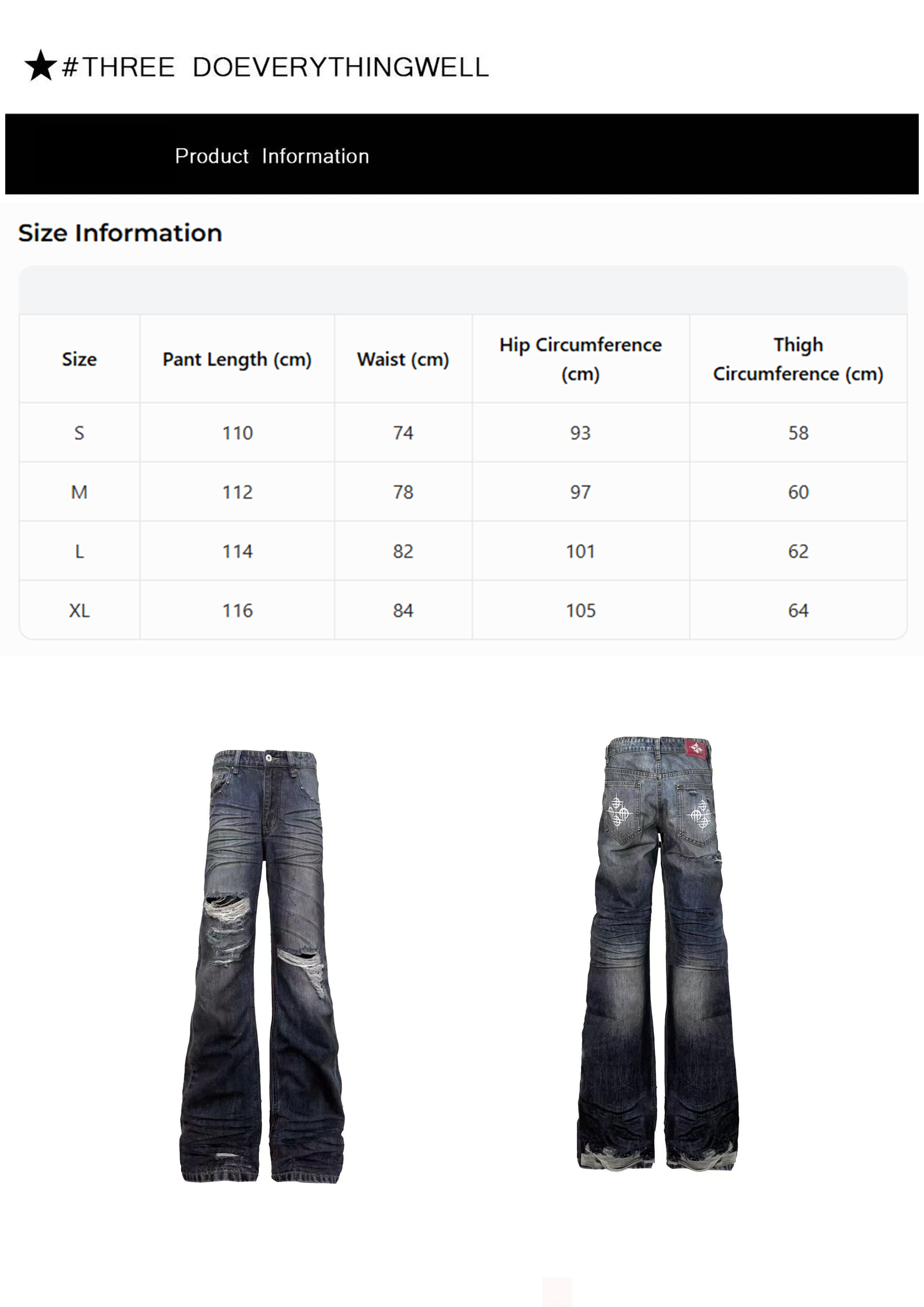 - Design Concept: The core design concept is "two-way balance of heavy vintage wasteland texture and punk street style". The heavy gradient vintage washed craft restores the natural fading and aging effect of 90s denim, while large distressed rips and wrinkle washing strengthen the worn-out texture of street wear. Cross totem prints on the back pockets inject dark rebellious attitude and enrich detail recognition. The classic high-waist flared silhouette achieves body slimming, leg shaping and daily practicality at the same time. The gender-neutral design adapts to diverse style expression for both men and women, highly fitting the current popular trend of American retro, Y2K millennial revival and wasteland punk streetwear.