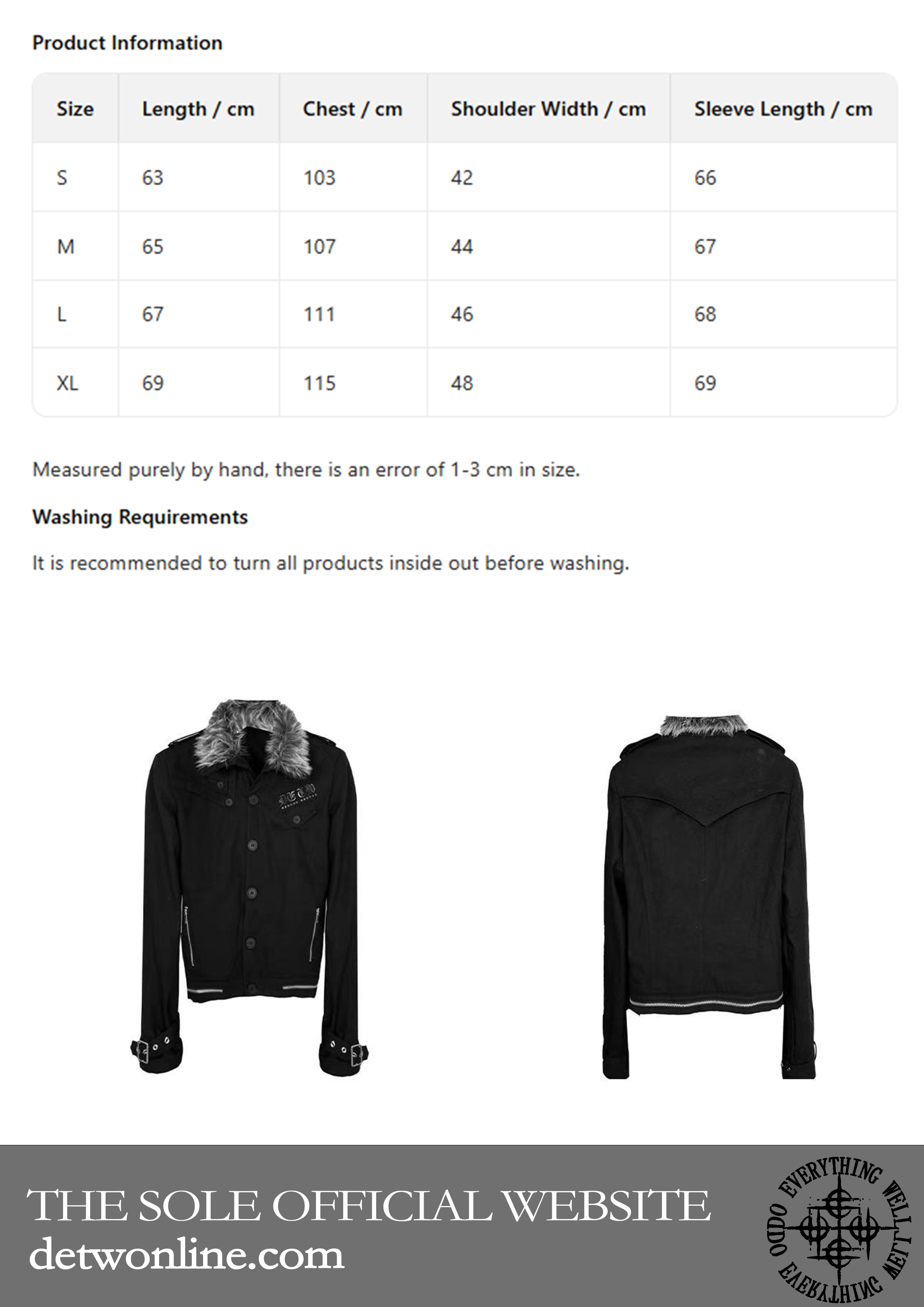 - Design Concept: Focusing on the style collision of retro military and dark punk, the 100% cotton material ensures texture and comfort. Custom hardware buckles and fur collar design enhance the style attribute, and the short fit improves the styling hierarchy, allowing people of different genders to create a unique look that combines the toughness of retro military and the personality of dark punk.