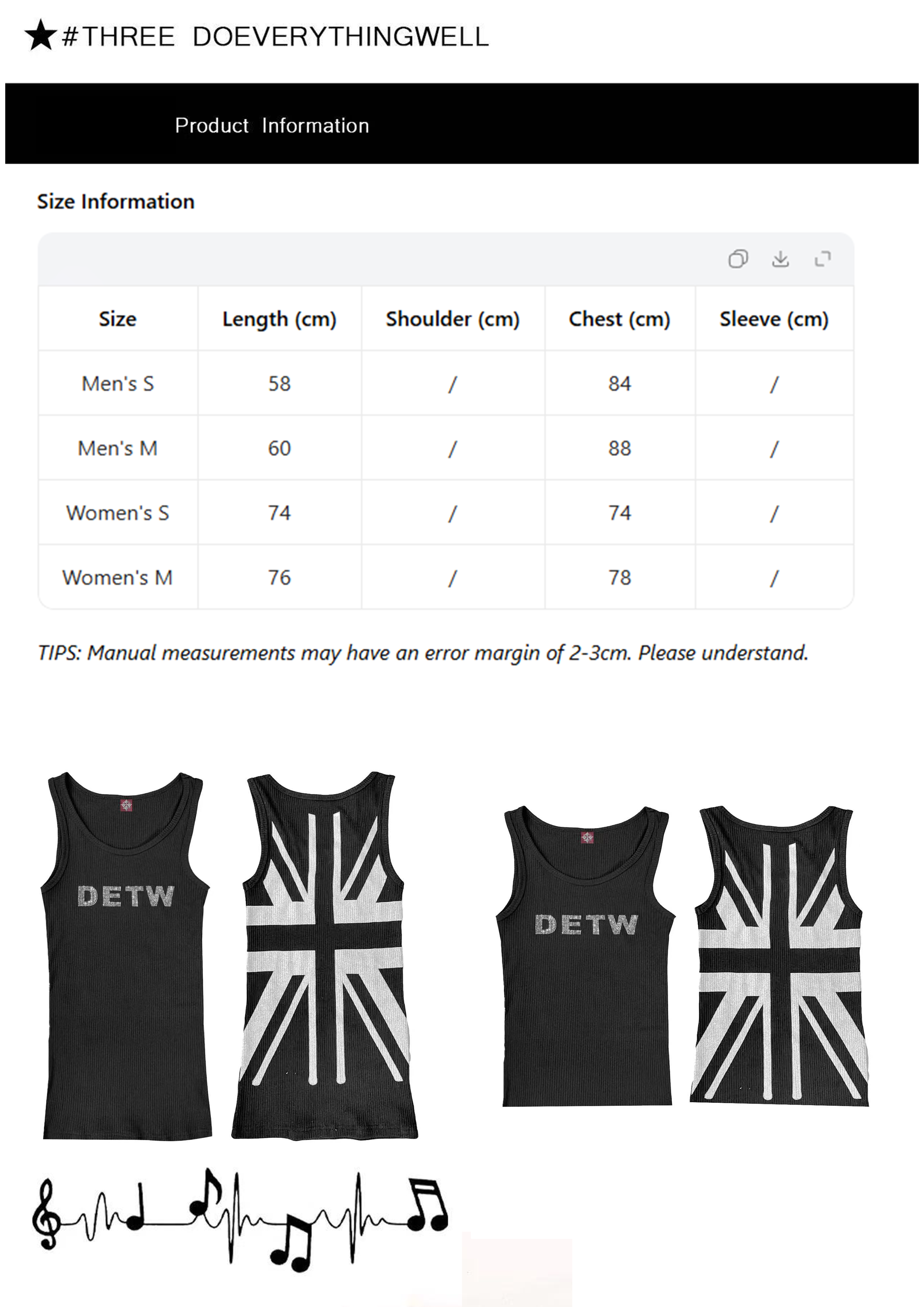 - Design Concept: The core design concept is the two-way integration of British retro and millennial punk. The ribbed knit fabric creates a slim-fit scoop neck silhouette, the front rhinestone lettering enhances brand recognition, and the back Union Jack print injects the soul of British retro, with vintage craftsmanship adding subculture texture. It aims to create a versatile item that combines brand identity, retro style and personality expression, meeting the dressing needs of young people for British punk and Y2K millennial style, realizing the collision of classic and trend.