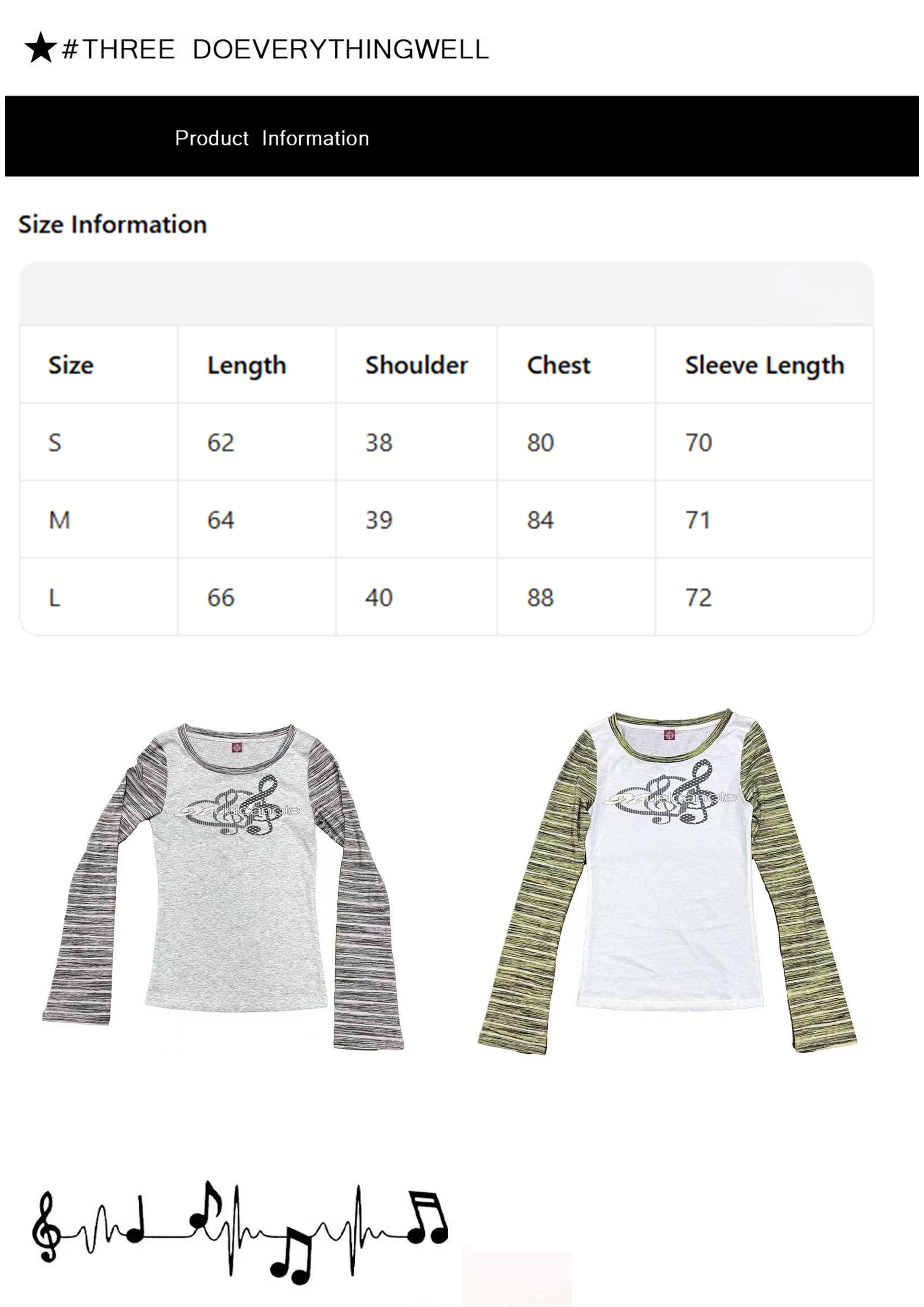 - Design Concept: The core design concept is the dual expression of music sentiment and millennial edgy-sweet style. The cooling ribbed fabric creates a comfortable and breathable wearing experience. The color-blocked striped sleeves and music note print strengthen the music theme, while the slim-fit crew neck + flared sleeve silhouette optimizes body proportions, combining retro feel and practicality. It aims to create a spring and summer item designed for music lovers, allowing wearers to express their love for music in daily outfits and align with the Y2K millennial spicy girl's edgy-sweet aesthetic, achieving dual satisfaction of style and comfort.