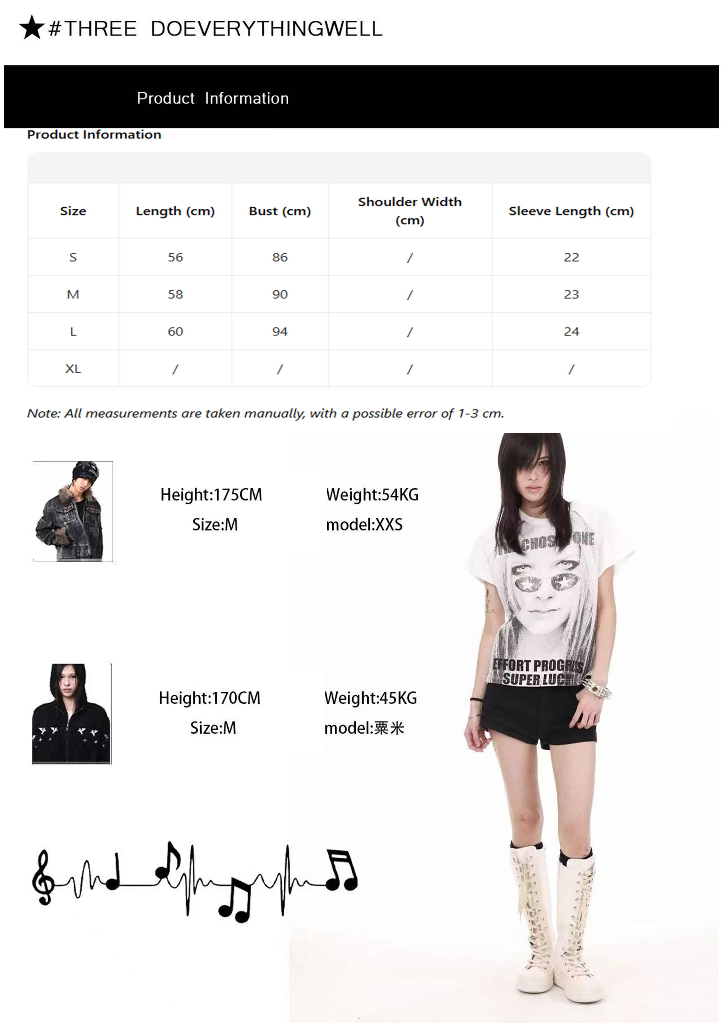 - Matching:For females: Wear this tee alone, pair it with black cuffed hot pants + over-the-knee slouch socks, finish with white platform high-top boots, and accessorize with a rivet bracelet and silver necklace to highlight the Y2K edgy-sweet parody style; it can also be paired with washed blue bootcut jeans for a retro street vibe. For males: Layer a black long-sleeve base top underneath to show the cuffs, pair it with black stacked bootcut jeans, finish with vintage derby boots, and accessorize with a dark punk bracelet to create an edgy-sweet neutral style.