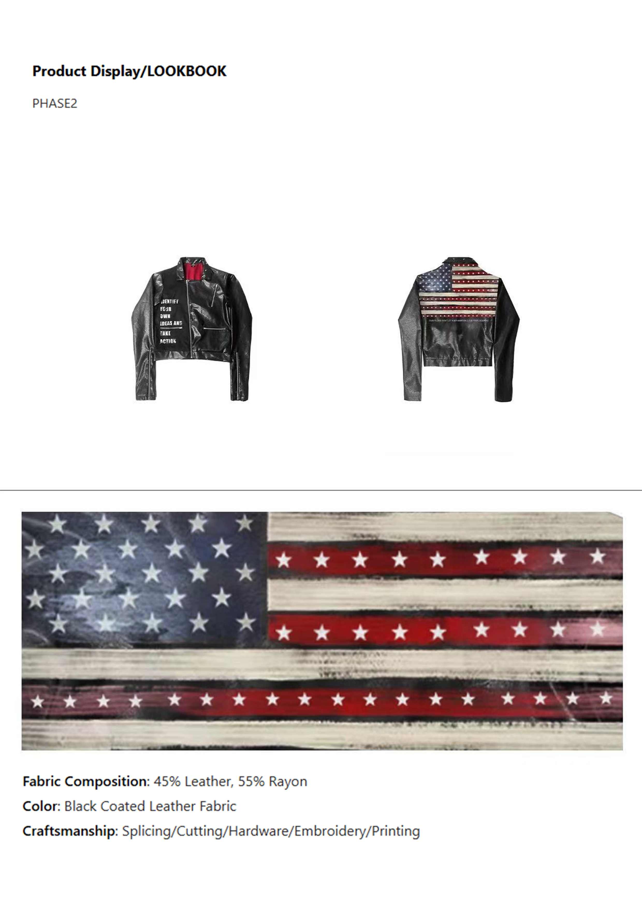 Deconstructing American culture from a pioneering perspective, the black leather carries a vintage Star - Spangled Banner print. The slogan "IDENTIFY YOUR OWN IDEAS AND TAKE ACTION" on the front conveys an independent spirit. Hardware details like rivets and zippers collide with the red lining to create a high - street item that combines rebellion and texture.